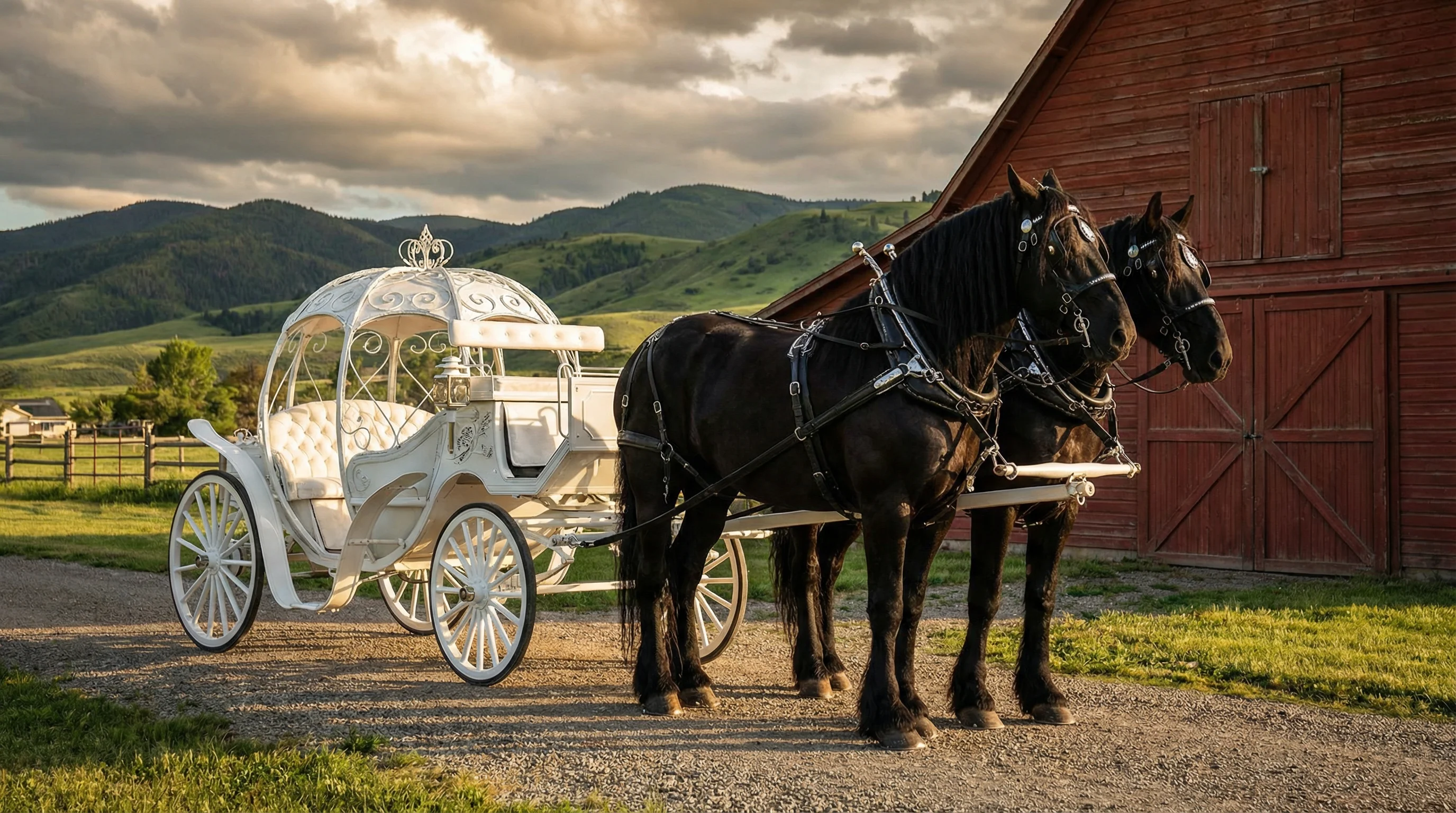 Make your wedding day unforgettable with a grand carriage entrance or a romantic departure beneath the stars. Our wedding carriage service includes a decorated carriage, a matched pair of Percherons, and an experienced driver in period attire.